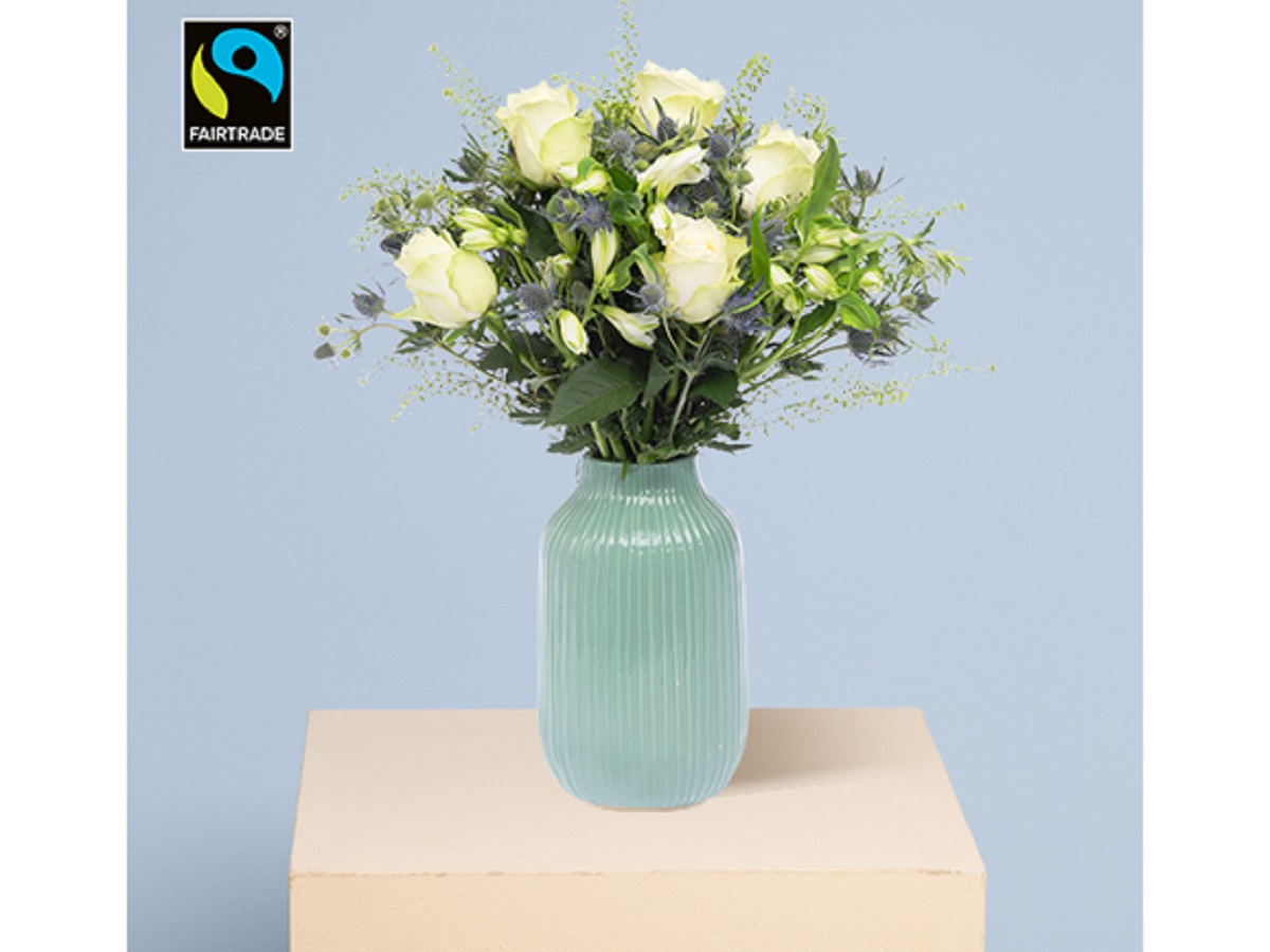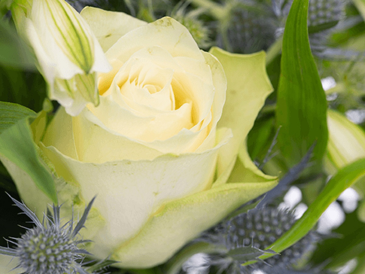 Roses in white to light yellow together with the dark blue of the thistles, staged by dark and light green – indeed an arrangement that shows kindness, courage and respect. There’s really no better way to say “thank you” than with this bundle. The diameter is about 30 centimetres, and a greeting card is included at no extra cost. All Bloomy Days arrangements are sent as loose flower stems, waiting to be individually arranged.