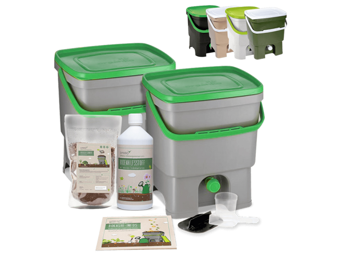 This practical set provides everything needed to set up one’s own Bokashi. In contrast to normal compost, kitchen waste is enriched with vitamins and enzymes during Bokashi production, helped by highly effective microorganisms which support the growth and resistance of garden and balcony plants. The liquid and solid substances produced during Bokashi production also promote the formation of humus in the soil.