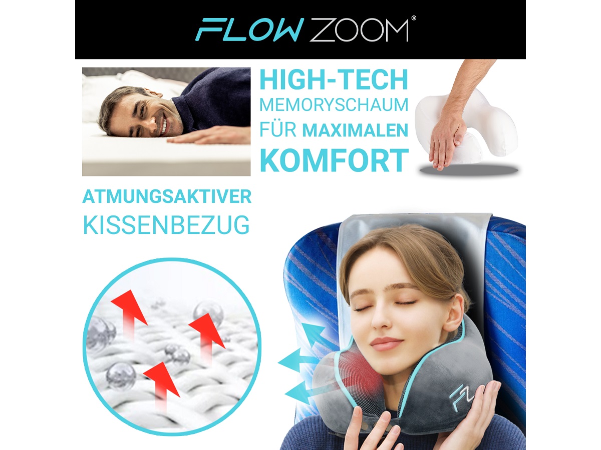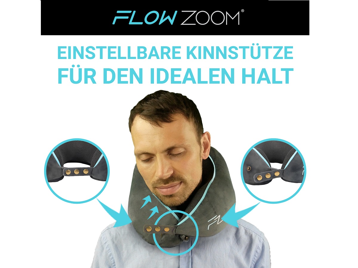FLOWZOOM presents a travel pillow that combines comfort and travel suitability. This pleasantly soft memory foam neck pillow can be individually adjusted by means of five different push buttons. As a result, it provides reliable support for the head not only to the side, but also to the front. The narrow pillow back ensures maximum comfort, especially on air travel, and the velvety soft, washable and breathable pillowcase ensures an ideal sleeping climate.